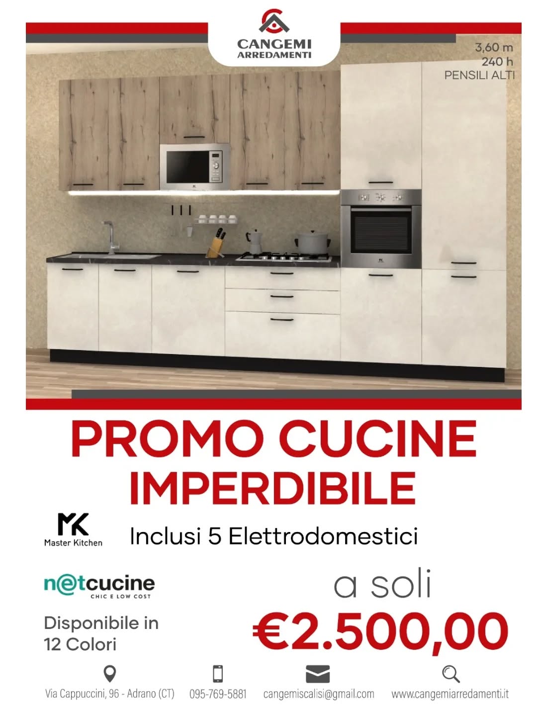 Scopri la cucina moderna da 3,6 metri, completa di elettrodomestici e progettata per unire funzionalità ed eleganza. Linee pulite, materiali di qualità e la possibilità di personalizzarla con diverse finiture e colori: il design perfetto per trasformare ogni giorno in un’esperienza di comfort e stile.